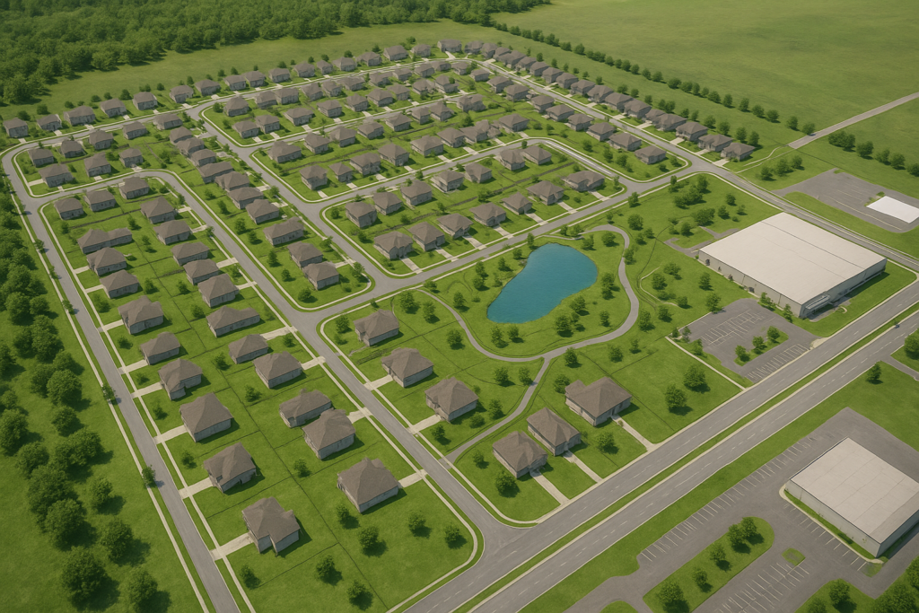 • Residential Lots & Neighborhoods: Flexible mix of lot sizes and product types (single-family, townhomes, small-lot cottages, and estate lots) distributed across the full 266 acres.