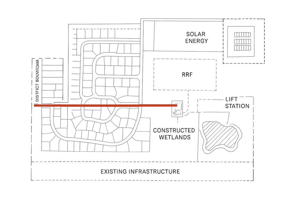 DISTRICT 01 is a 266-acre master-planned residential subdivision designed around a resident-owned wastewater resource recovery utility. The community converts wastewater into reclaimed water, Class A biosolids, renewable natural gas (RNG), and struvite fertilizer. These revenue-generating activities support a dividend program through resident-owned stock and revenue bonds.