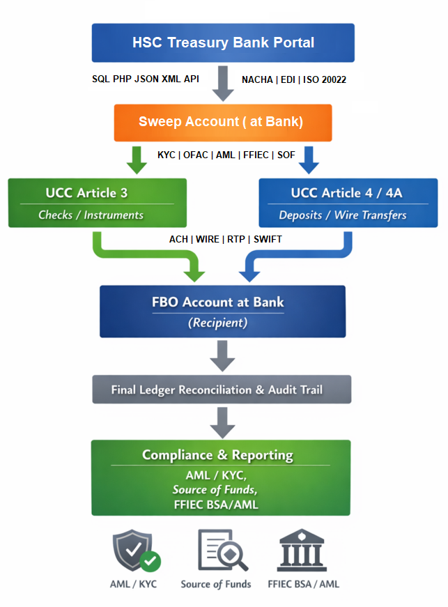 Distributing EFT between HSC treasury ledger and bank accounts Subject to AML/KYC, source-of-funds validation, and FFIEC BSA/AML review Finality achieved via book entry or internal sweep Executed via UCC 4A wires Bank provides settlement confirmation and legal finality Reconciled GL-to-GL